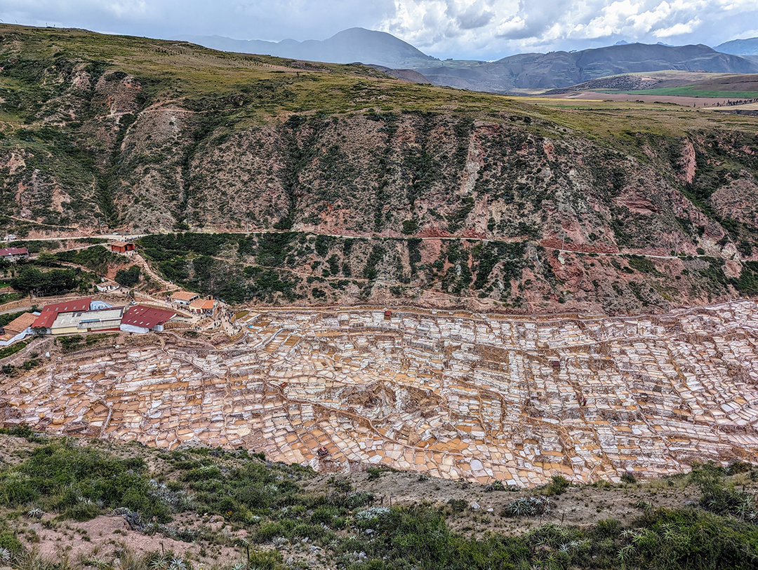 The site features over 3,000 salt evaporation ponds terraced along the hillside at 3,380 meters (11,089 feet) in the heart of the Sacred Valley. These salt ponds have been in use since pre-Inca times, and they’re still operated by local families today. During our visit, we even saw people actively harvesting salt by hand. The system works by channeling a natural underground spring, rich in salt, into the ponds. The sun does the rest, evaporating the water and leaving behind crystallized salt, just as it has for centuries.