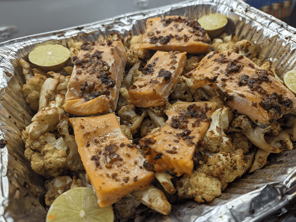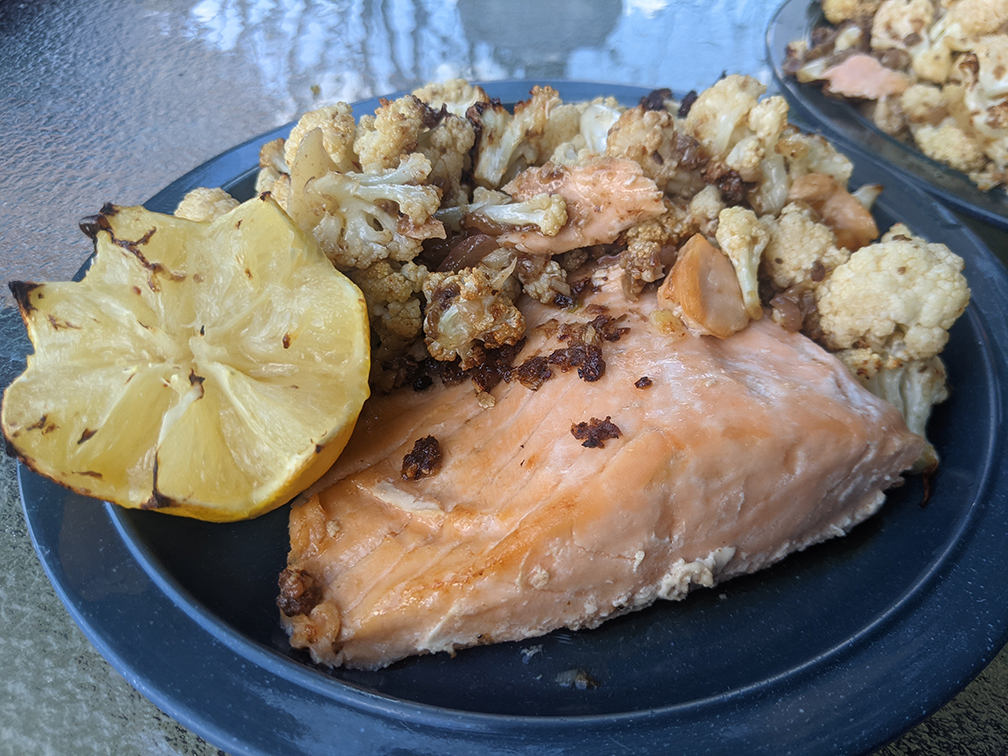 - Add the salmon to the top of the cauliflower and return the dish to the oven for 10 more minutes.