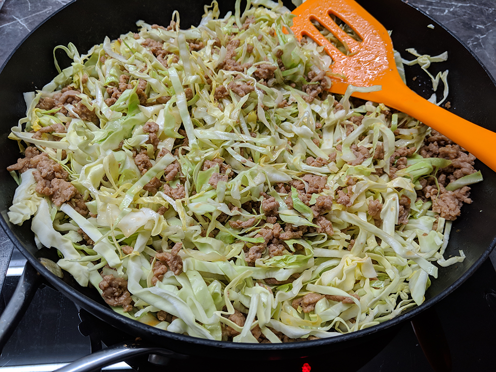 - Add in the shredded cabbage and cook until the cabbage is at your preferred consistency.