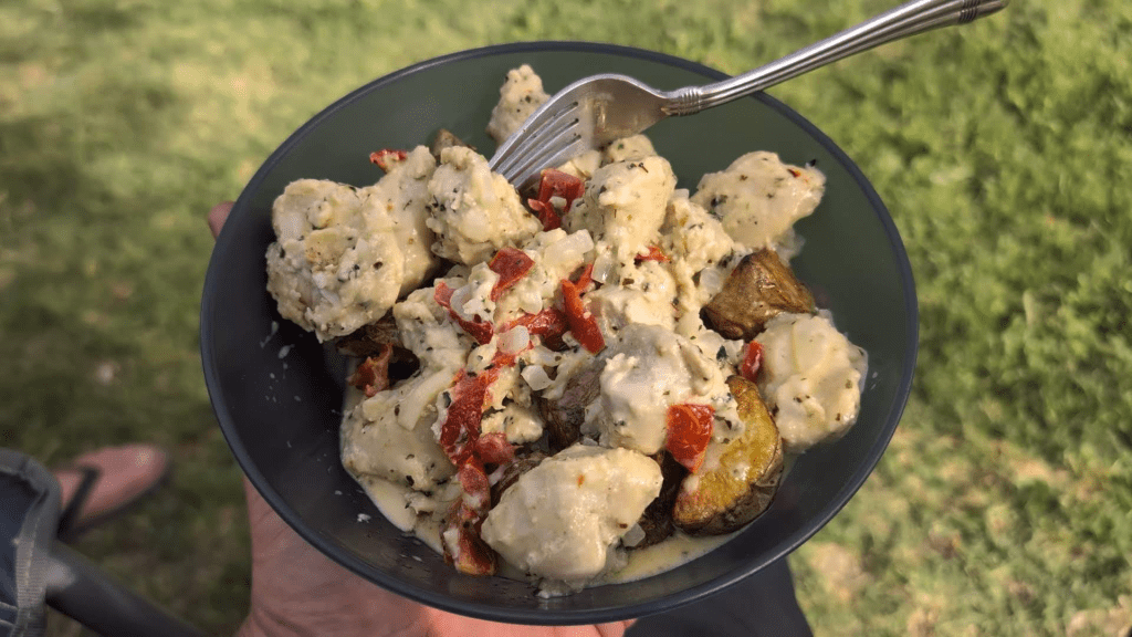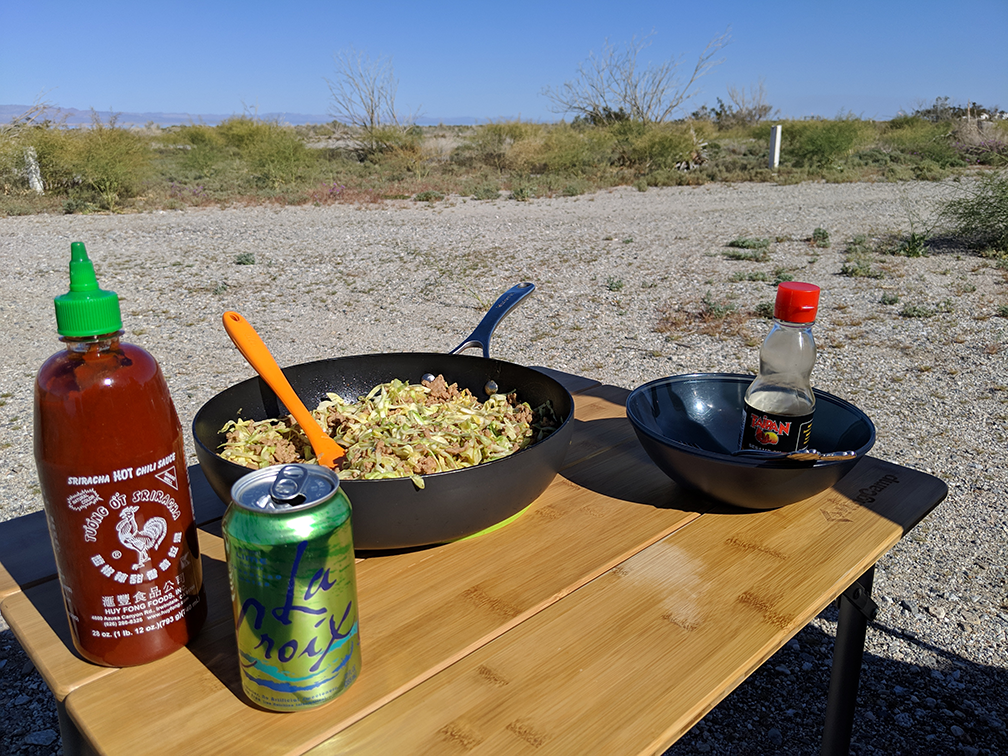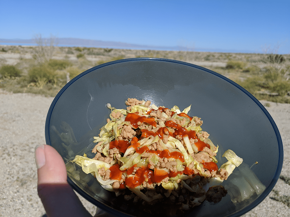 - Remove from heat and add green onions, sesame seeds, and hot sauce if you have those things available in your overland pantry!